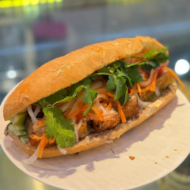 Crispy-on-the-outside tofu, signature sauce, tucked with pickled veggies, cucumber, cilantro, sriracha, and house sauce.