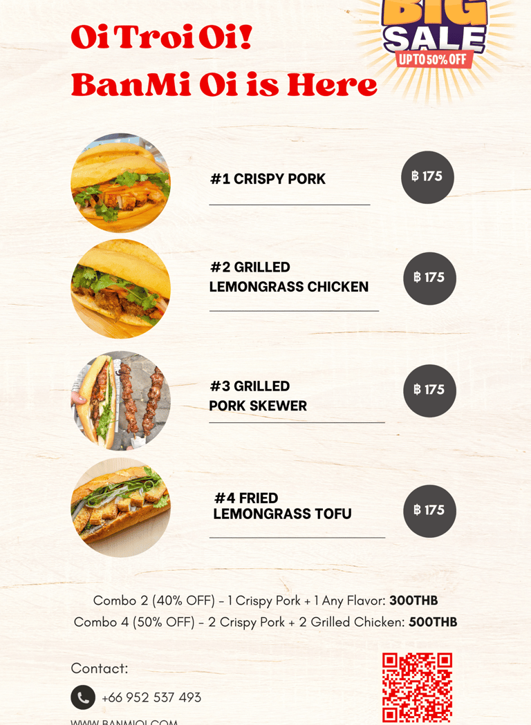 Tender grilled pork infused with special Vietnamese BBQ sauce, tucked with pate, pickled veggies, cucumber, cilantro, sriracha.